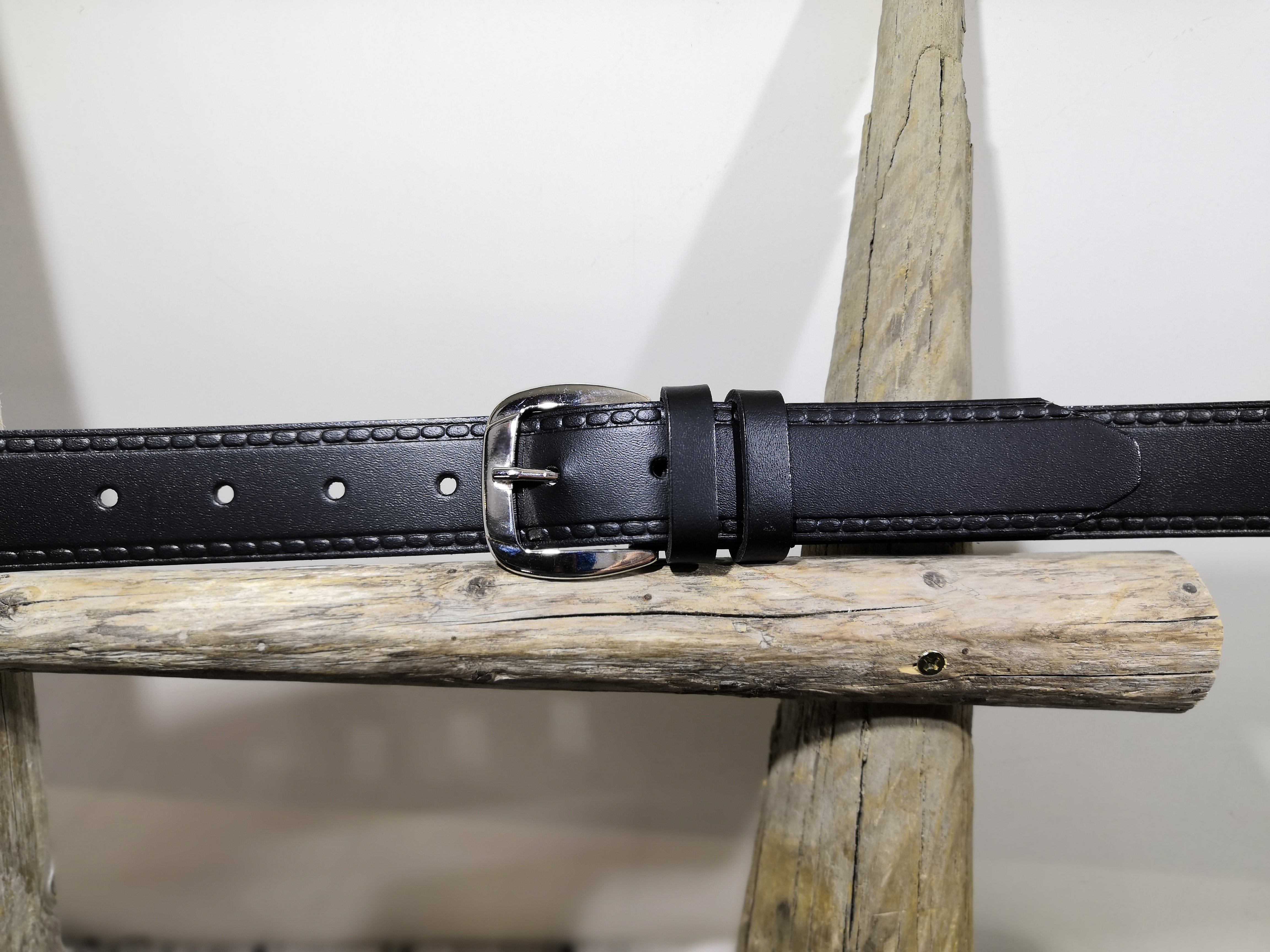 Aitoa nahkaa. Vyössä on valusolki. Vyön reunassa painettu valeketjutikki.