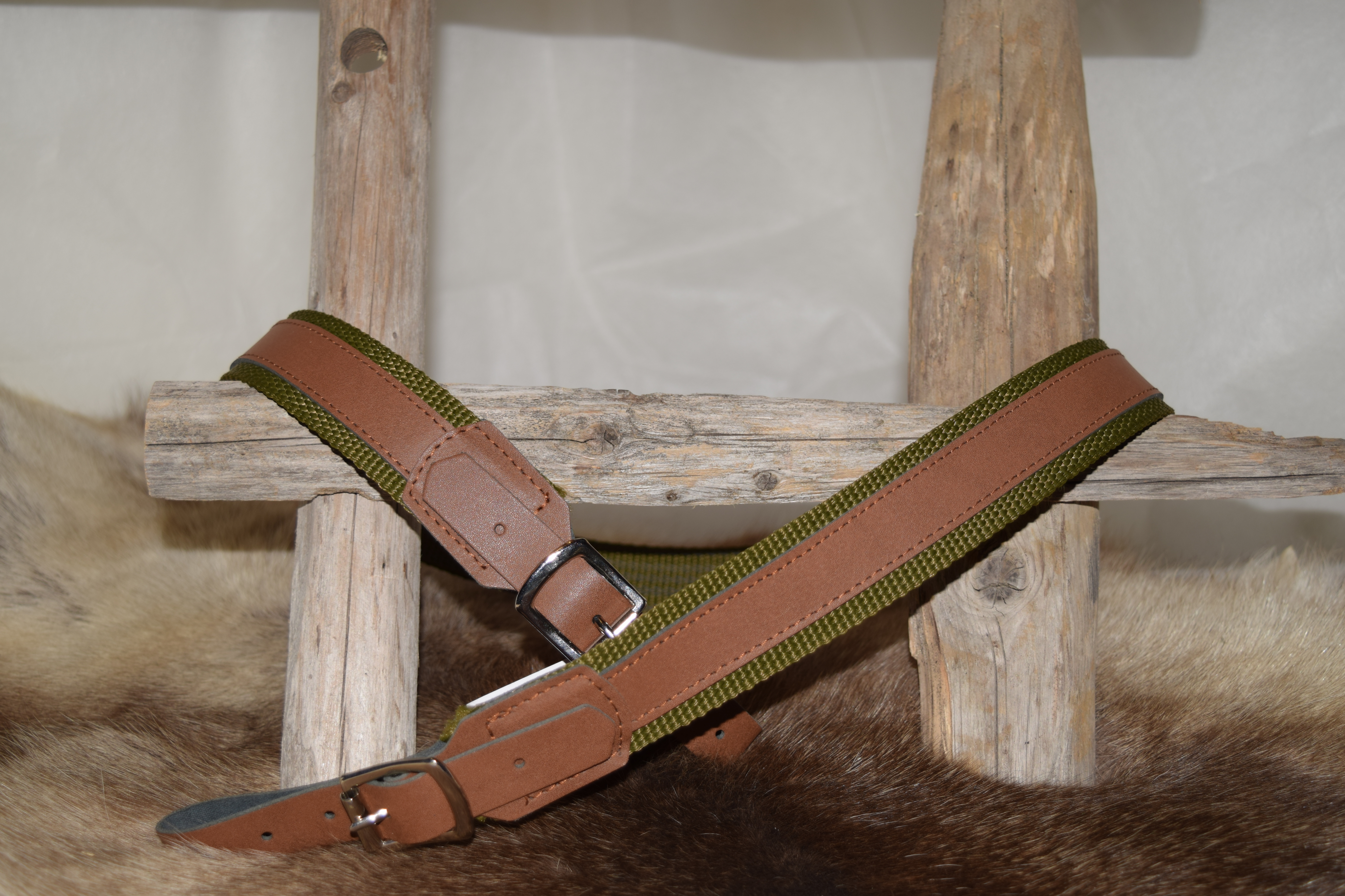 Alla 35mm kotimainen liukuestonauha ja päällä 25mm nahka. Nahka osat aitoa nahkaa.