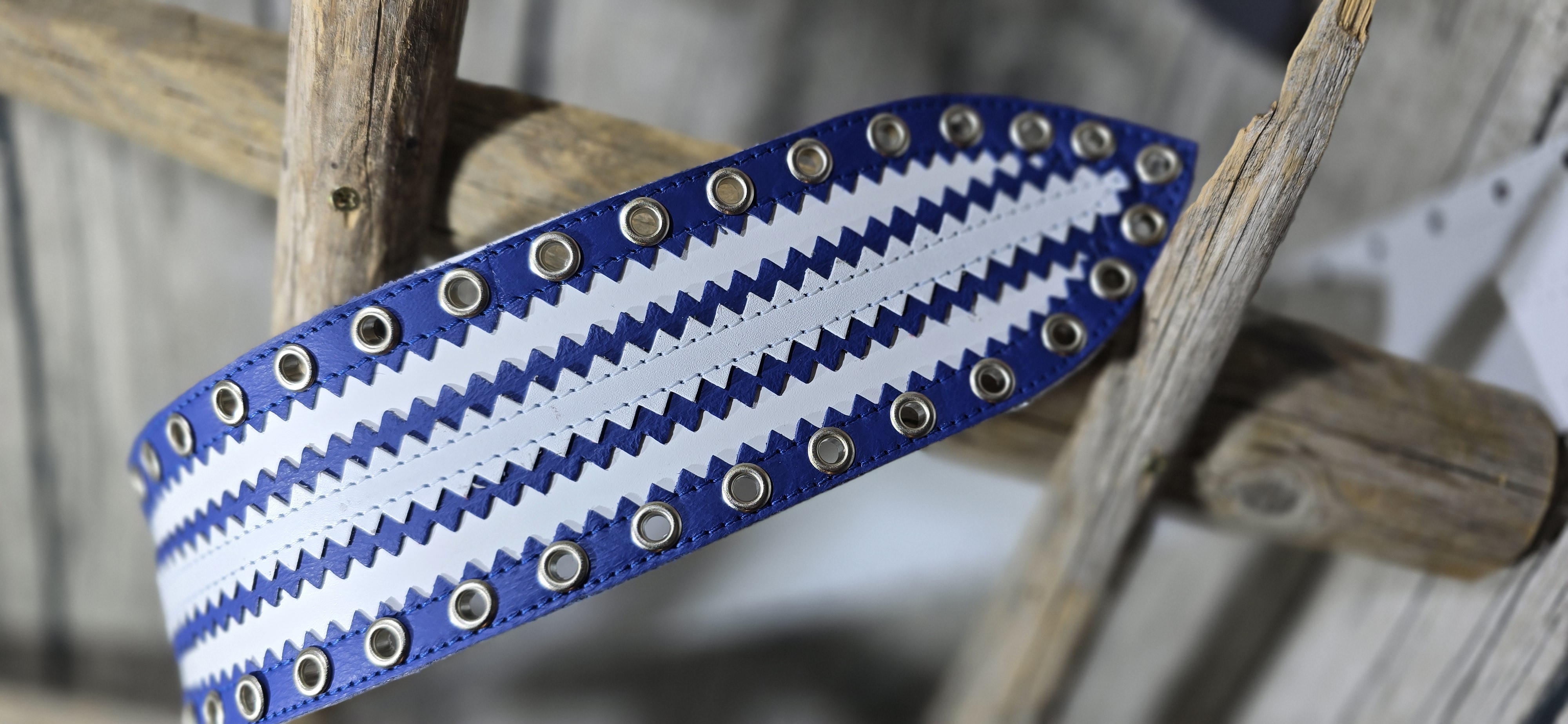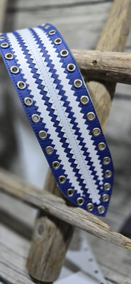 Aitoa nahkaa oleva 70mm leveä lapinvyö pohjaväri valkea ja harkot sininen ja valkea. Sirkat niklatut.