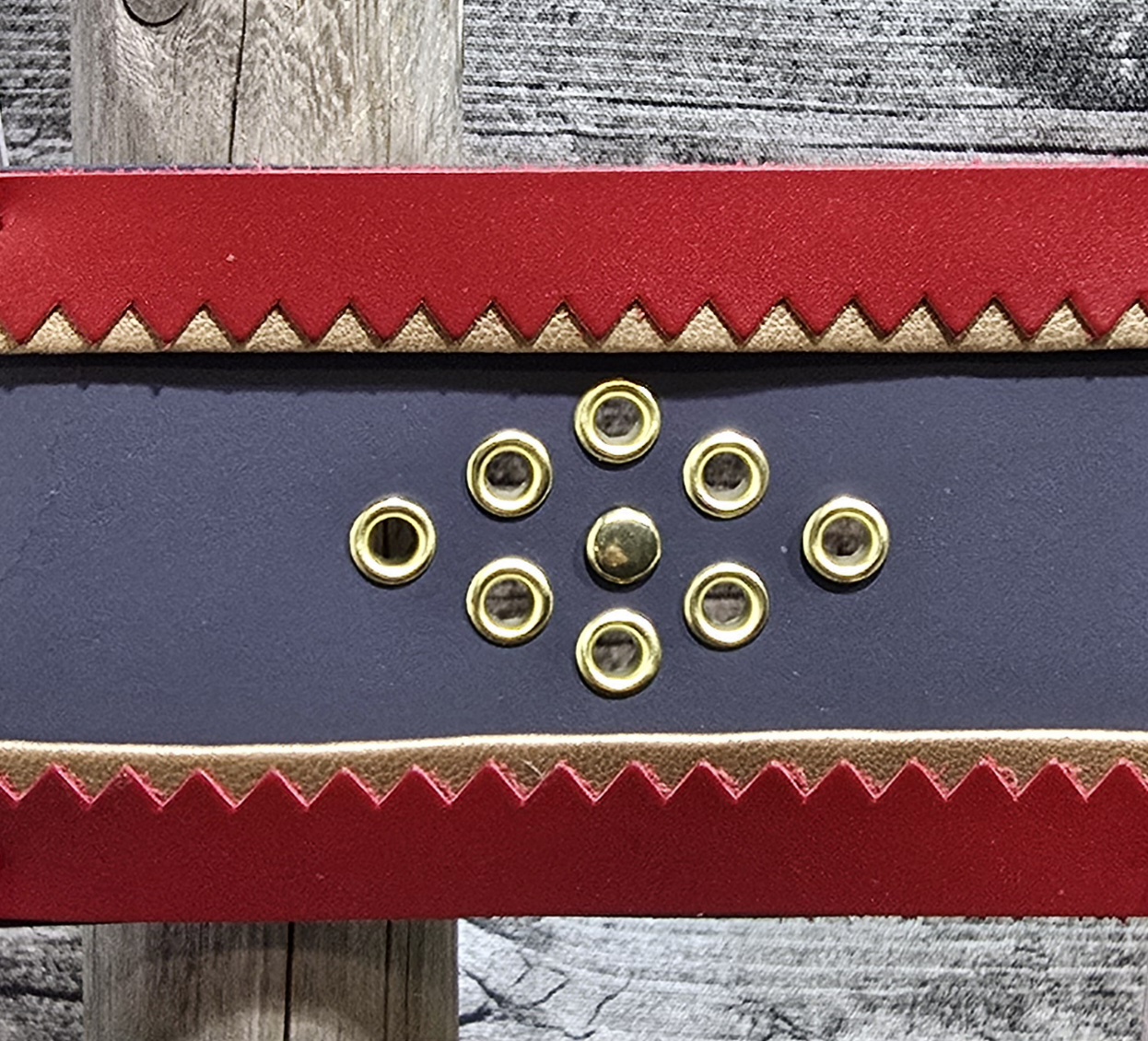 70mm harmaa nahkapohjalla reunoissa kultanauha ja päällä punainen harkkoreunainen nahkanauha. koristeena kultaiset sirkat, keskellä kultainen niitti.