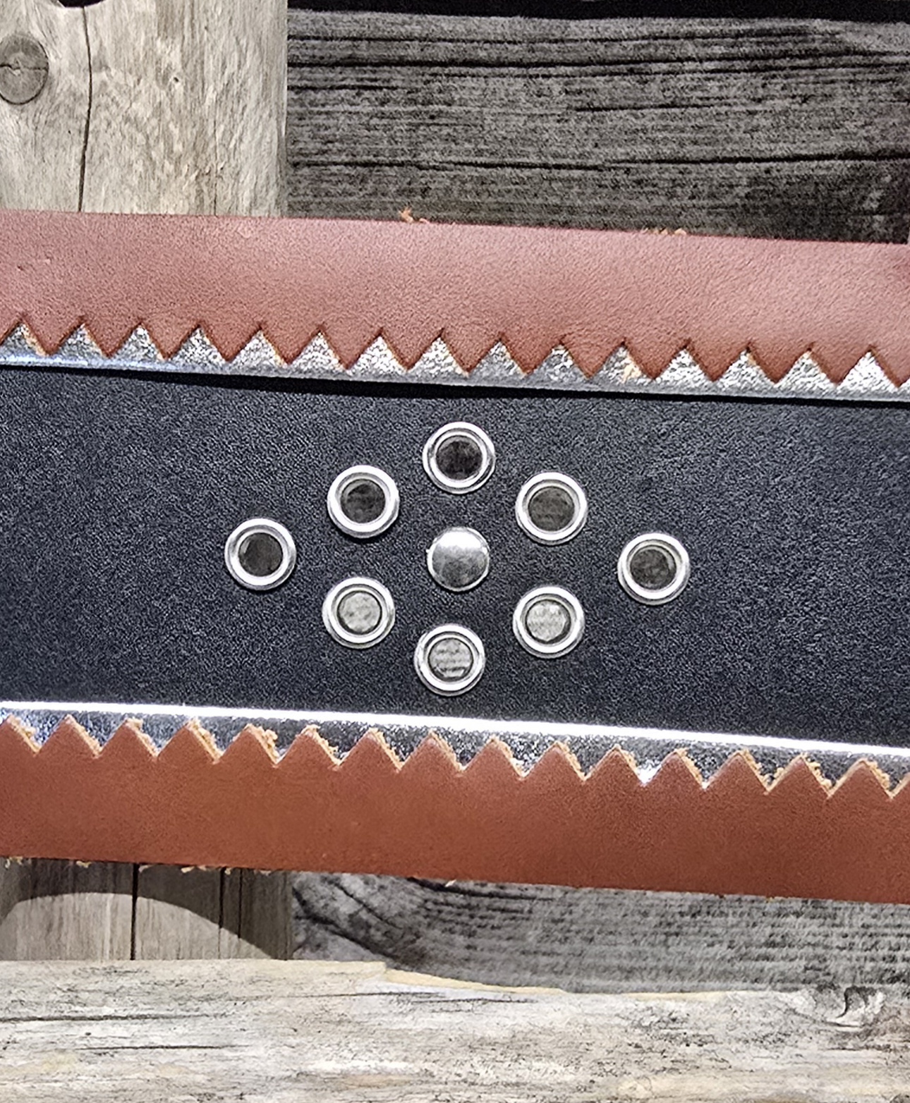 70mm mustalla nahkapohjalla reunoissa hopeanauha ja päällä konjakinruskea harkkoreunainen nahkanauha. koristeena niklatut sirkat, keskellä niklattu niitti.