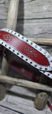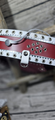 70mm punaisella nahkapohjalla reunoissa hopeanauha ja päällä valkoinen harkkoreunainen nahkanauha. koristeena niklatut sirkat, keskellä niklattu niitti.