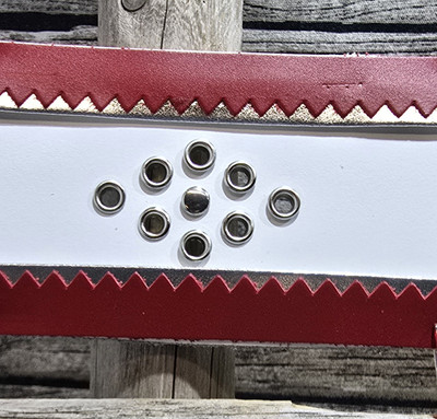 70mm valkealla nahkapohjalla reunoissa hopeanauha ja päällä punainen harkkoreunainen nahkanauha. koristeena niklatut sirkat, keskellä niklattu niitti.