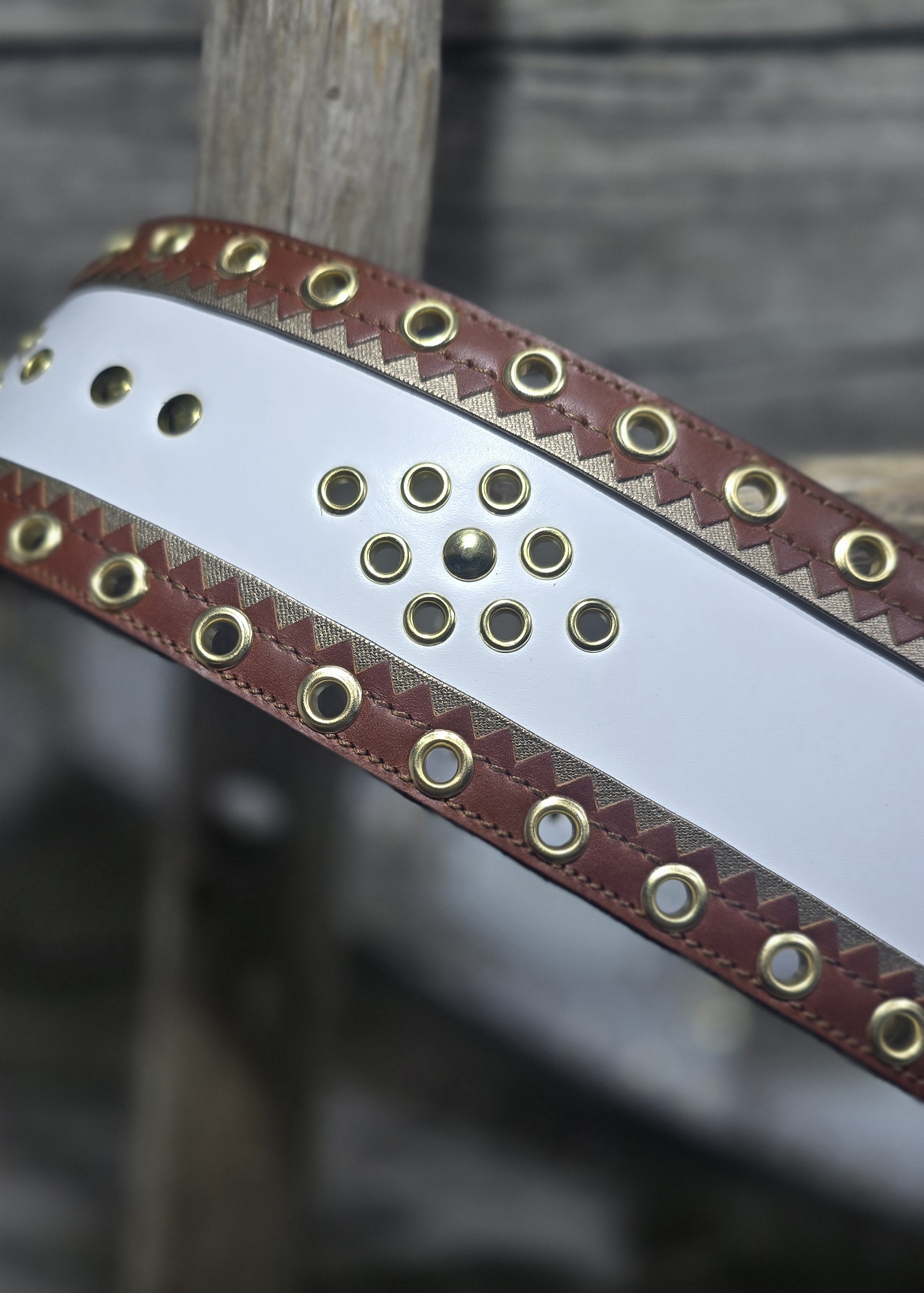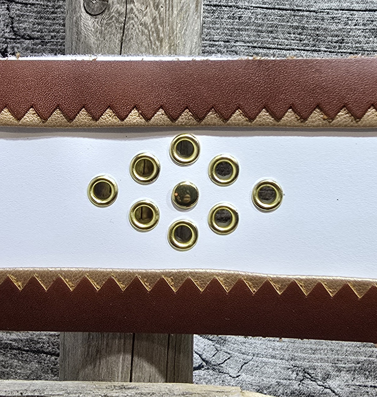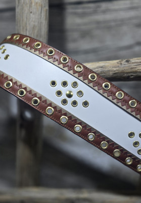 70mm valkealla nahkapohjalla reunoissa kultanauha ja päällä konjakinruskea harkkoreunainen nahkanauha. koristeena kultaiset sirkat, keskellä kultainen niitti.