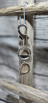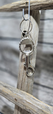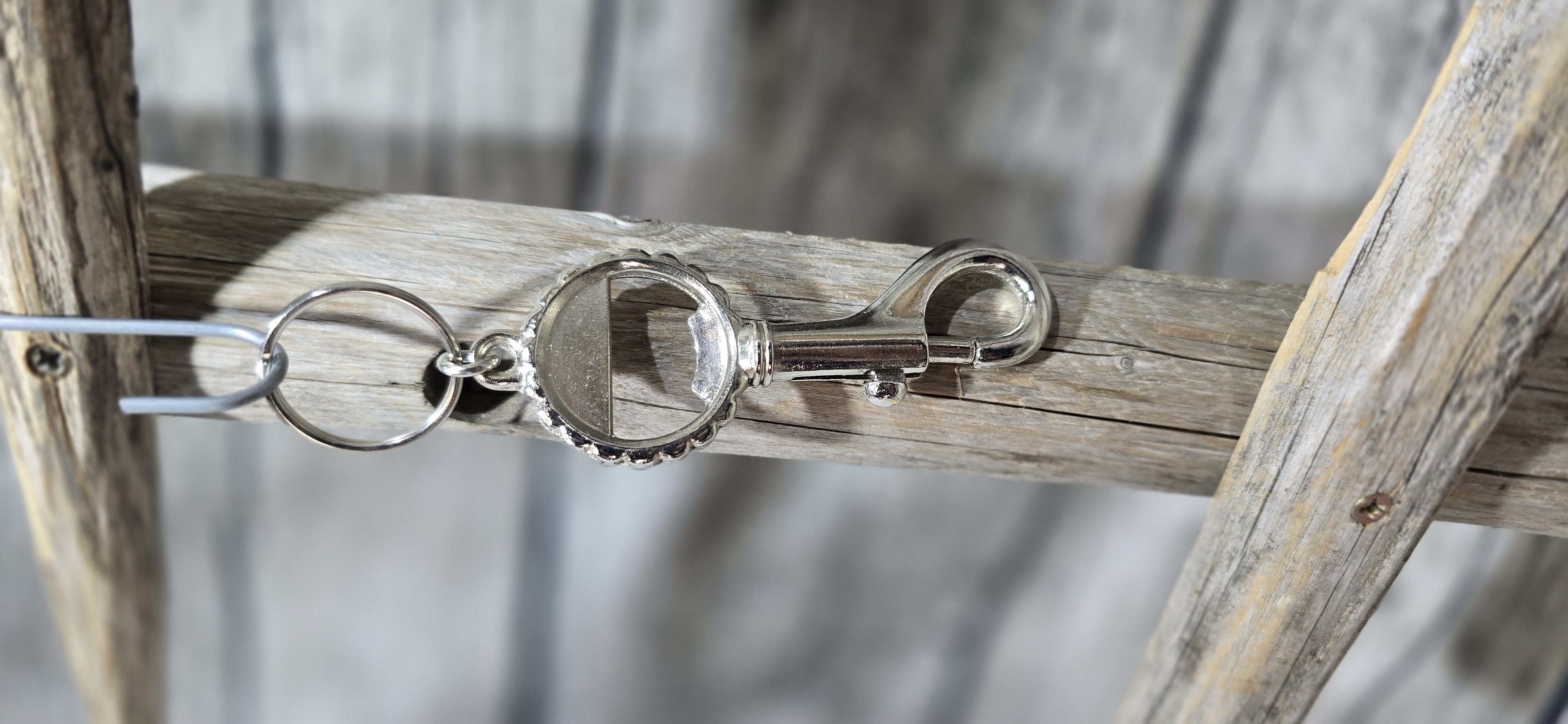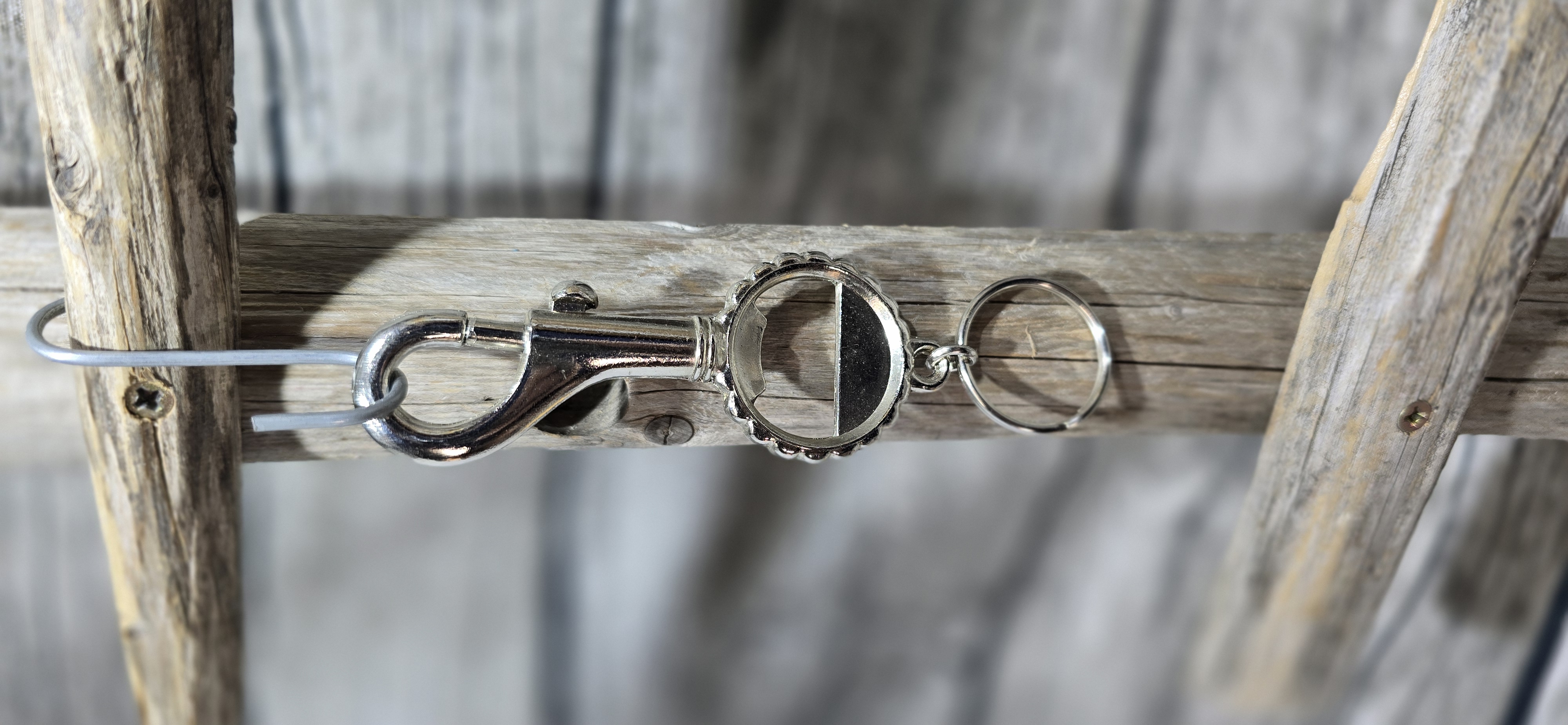 Metallinen jousihaka jossa pullonavaaja ja avainlenkki