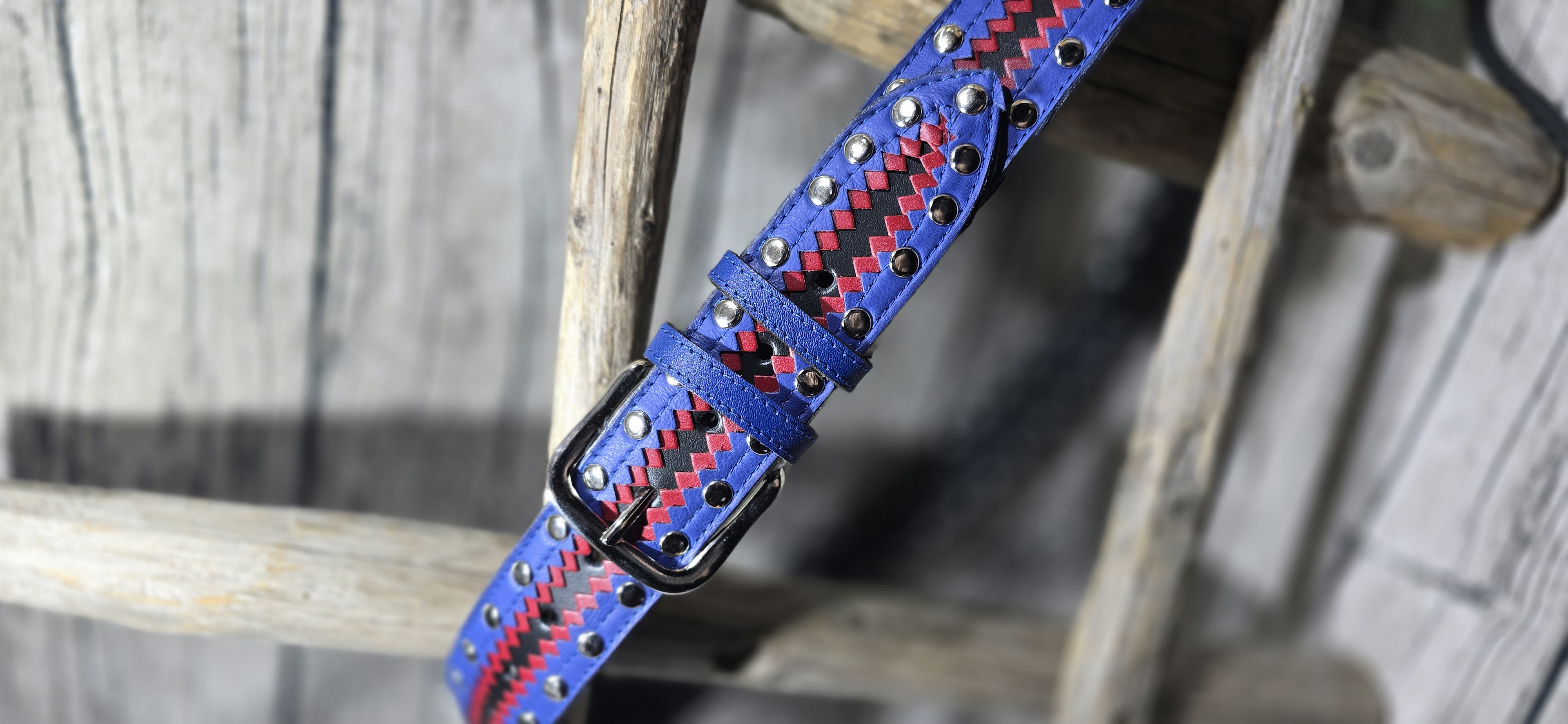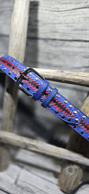 40mm niklatulla niiteillä oleva housuvyö. Värit musta pohja ja päällä punainen ja sininen