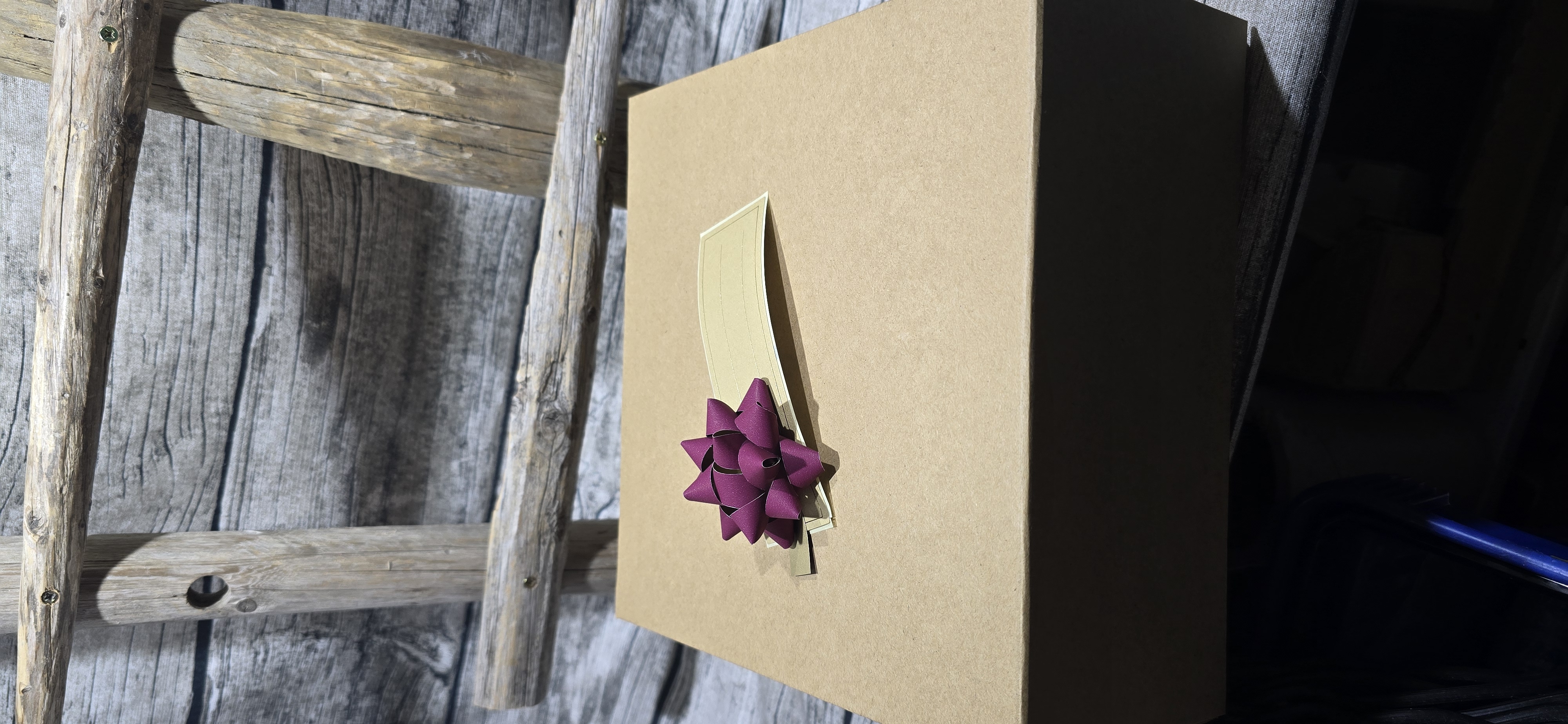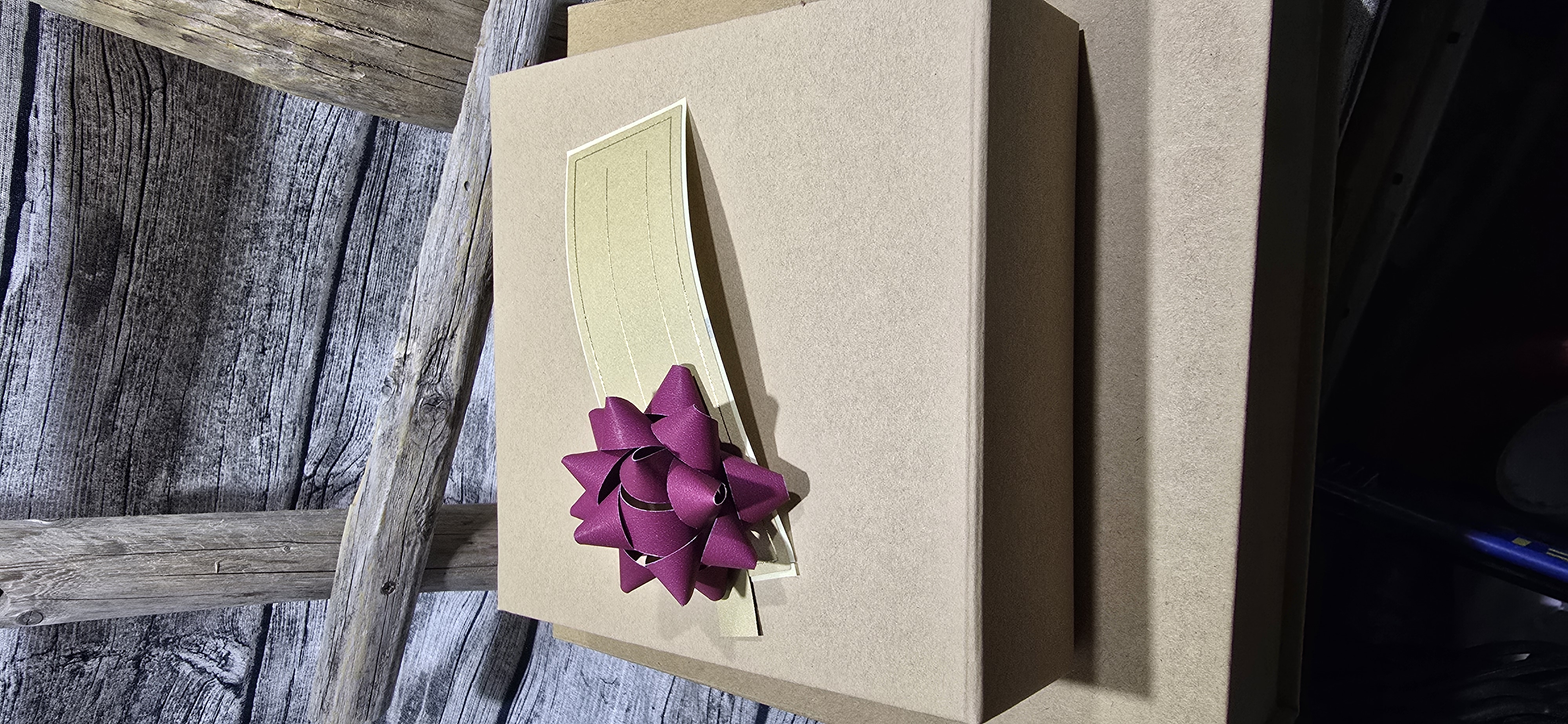Jokaisen laatikon mukana tulee lahjarusetti kortilla johon saa esim nimen. Näitä ei liimata valmiiksi vaan sujautetaan laatikon sisään ettei litisty.