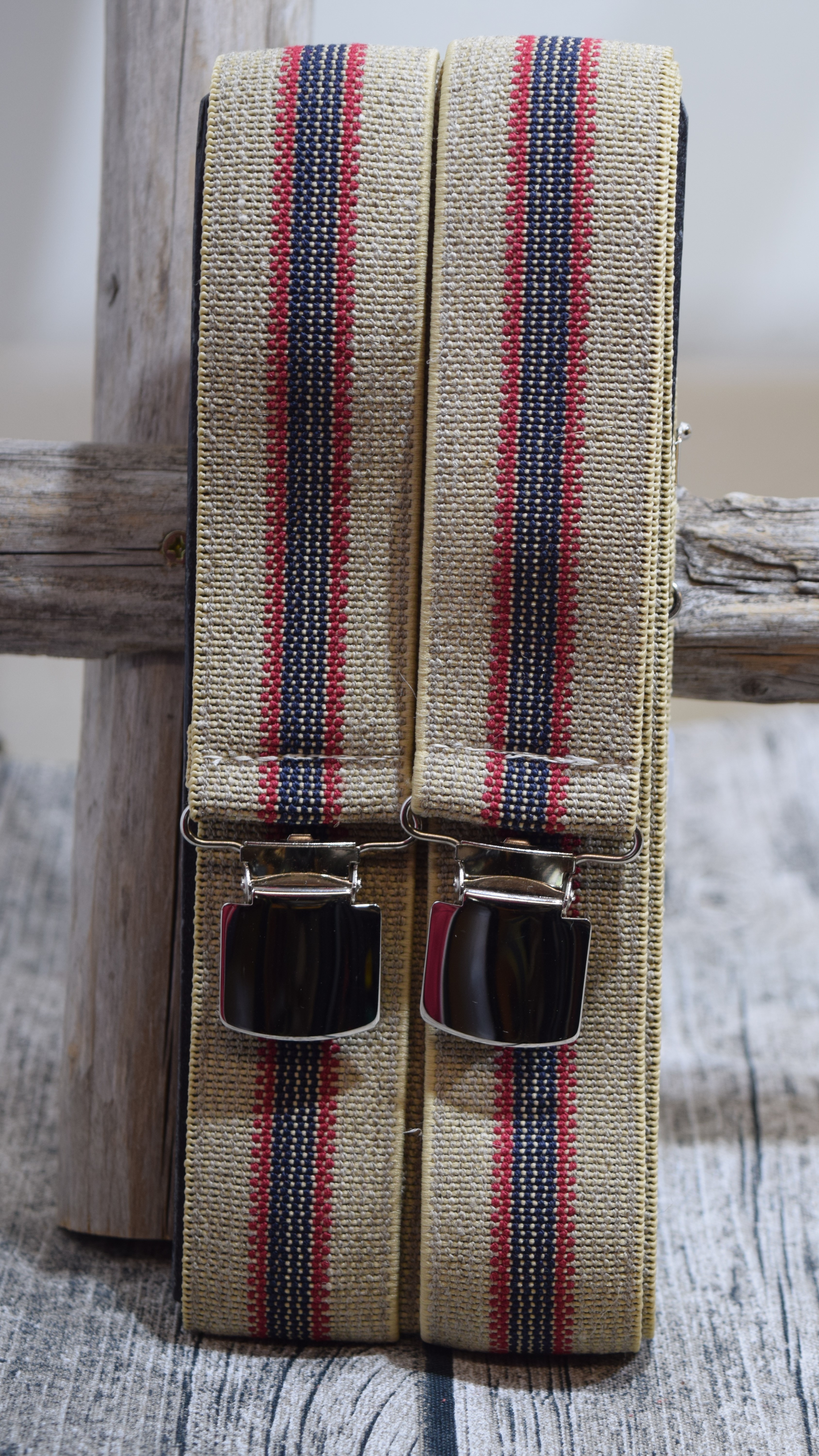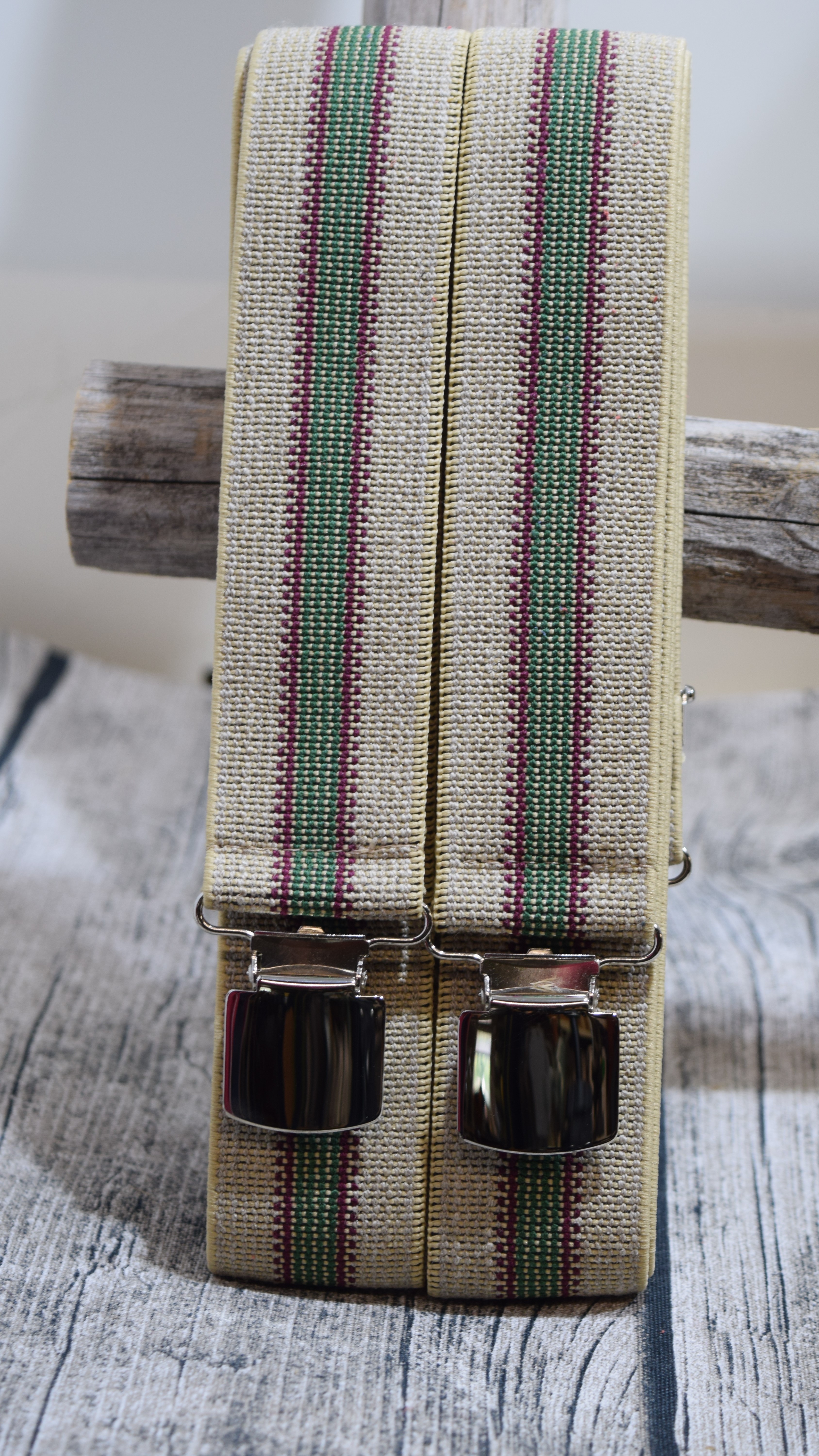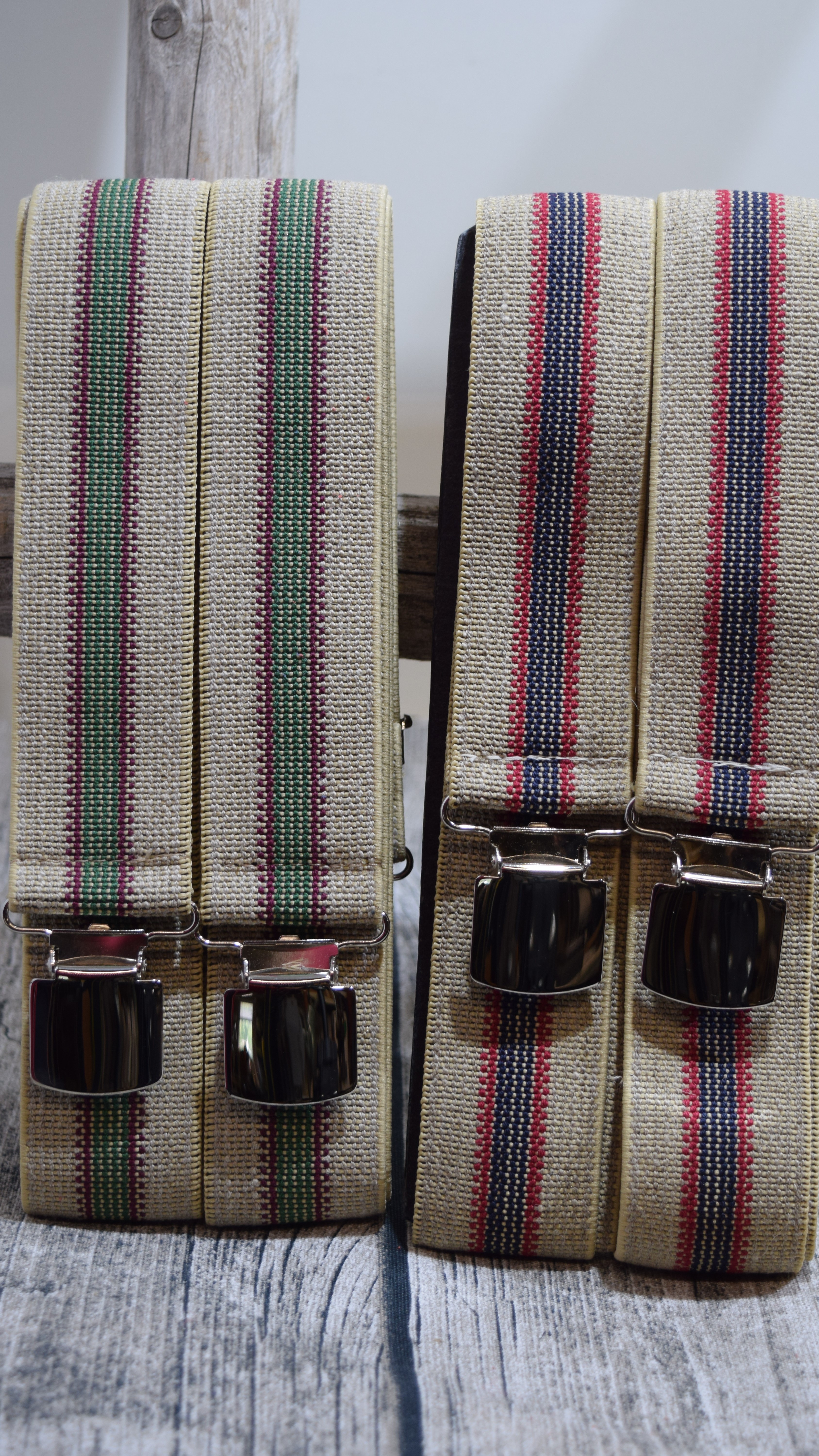 Näissä henkseleissä on pellavan värinen ja rouheisempi pinta kuin muissa henkseleissä. Toisessa on keskellä vihreä raita ja toisessa sininen. Kummassakin olkain vaihtoehdossa on keskellä olevan värin molemmin puolin punaiset ääriviivat.